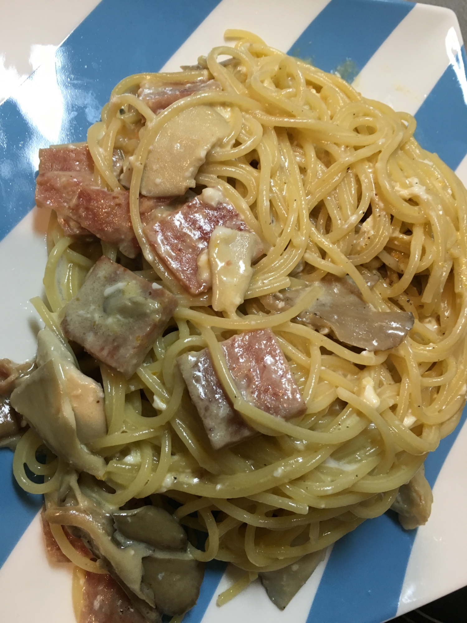 生クリーム不使用 スパムと舞茸入りカルボナーラ レシピ 作り方 By 素早く作れる料理専門会社員 楽天レシピ