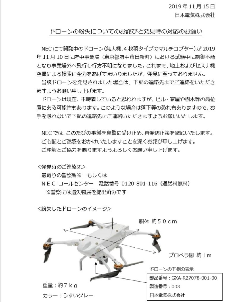 迷子 のドローン今どこに Necが必死の捜索続けるもいまだ見つからず 日経クロステック Xtech