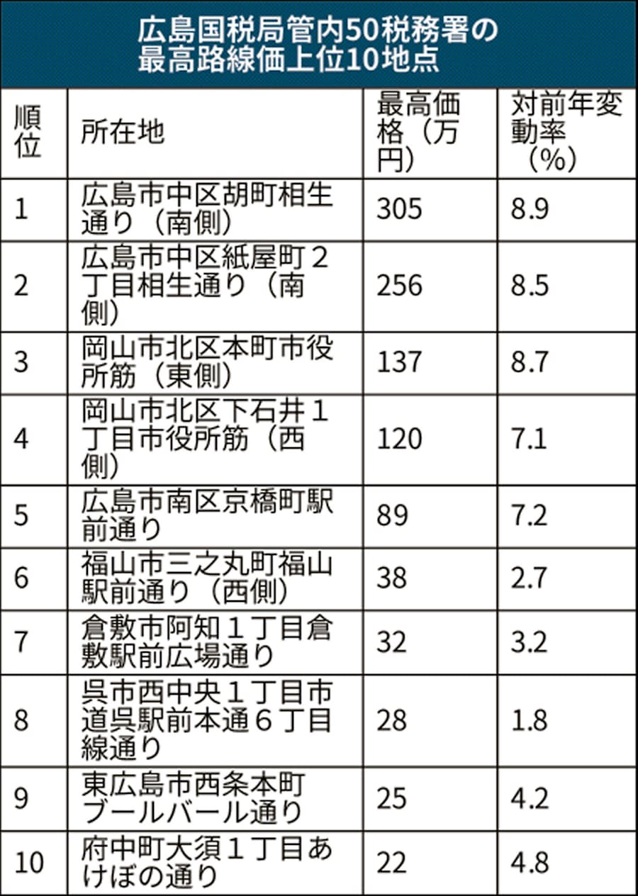 中国5県の路線価 2年連続上昇 広島 岡山けん引 日本経済新聞